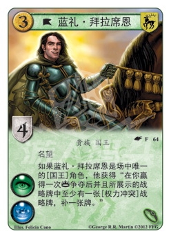 如果蓝礼·拜拉席恩是场中唯一的[国王]角色,他获得“在你赢得一次权力争夺争夺后并且所展示的战略牌中至少有一张[权力冲突]战略牌,补一张牌。”