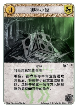 响应:在权力争夺争夺中你宣告进攻角色后,将御林小径放置进暗影区,选择并横置一名守方玩家控制的拥有权力争夺符号的角色。