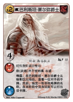 :在巴利斯坦·赛尔弥爵士从暗影区出场后,查看一位对手的手牌。然后,指定一张非战略牌的名称,在本阶段中没有玩家可以打出该卡牌。