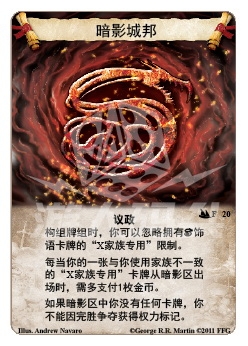 每当你的一张与你使用家族不一致的“X家族专用”卡牌从暗影区出场时,需多支付1枚金币。