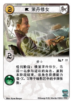 :横置茉丹修女,选择一名参与进攻的角色。直到本阶段结束,该角色获得能力值-X。X等于暗影区中的卡牌张数。