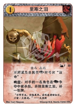 响应:对手的一名角色在阴谋争夺争夺中被杀后,弃除里斯之泪,补一张牌。