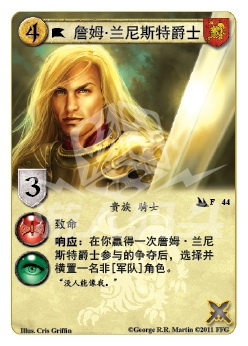 响应:在你赢得一次詹姆·兰尼斯特爵士参与的争夺后,选择并横置一名非[军队]角色。