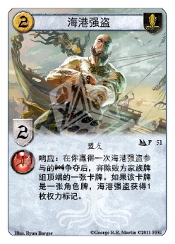 功能说明 响应:在你赢得一次海港强盗参与的军事争夺争夺后,弃除败方家族牌组顶端的一张卡牌。如果该卡牌是一张角色牌,海港强盗获得1枚权力标记。