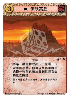 功能说明 争夺:横置伊耿高丘,查看一位对手的手牌。你可以从其手牌中选择一张角色牌放置到其拥有者的死亡牌堆。