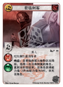 :在君临刺客从暗影区出场后,选择一名没有附属的角色。直到本阶段结束,该角色获得能力值-2并当能力值为0时,杀死该角色。