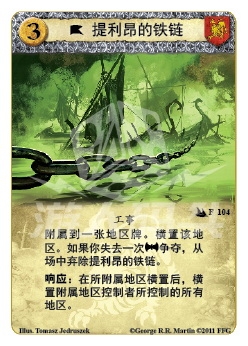 功能说明 附属到一张地区牌。横置该地区。如果你失去一次军事争夺争夺,从场中弃除提利昂的铁链。