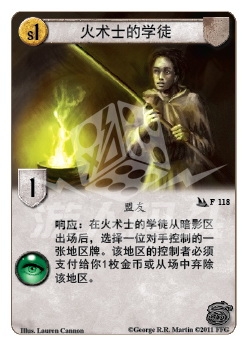:在火术士的学徒从暗影区出场后,选择一位对手控制的一张地区牌。该地区的控制者必须支付给你1枚金币或从场中弃除该地区。
