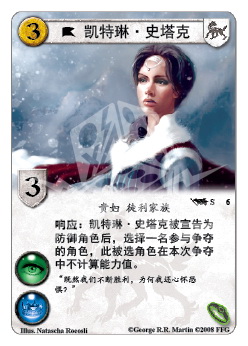 功能说明 响应:凯特琳·史塔克被宣告为防御角色后,选择一名参与争夺的角色,此被选角色在本次争夺中不计算能力值。
