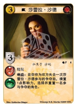 :在你作为攻方失去一次莎蕾拉·沙德参与的争夺后,横置1点影响力,选择并重置一名参与争夺的角色。