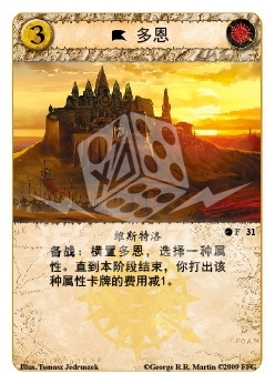 功能说明 备战:横置多恩,选择一种属性。直到本阶段结束,你打出该种属性卡牌的费用减1。