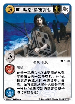 在任一玩家以4点或更高的总强度差值失去一次争夺后,他/她指定角色或地区卡牌类型。然后,如可能则从场中选择并弃除一张他/她所控制的指定类型卡牌(不能援救)。