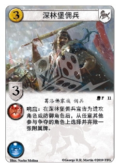 :在深林堡佣兵宣告为进攻角色或防御角色后,从任意其他参与争夺的角色上选择并弃除一张附属牌。
