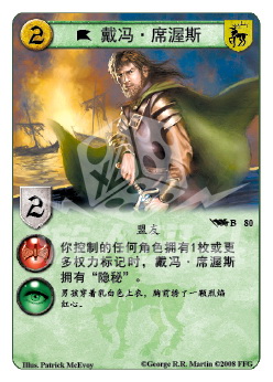 功能说明 你控制的任何角色拥有1枚或更多权力标记时,戴冯·席渥斯拥有“隐秘”。