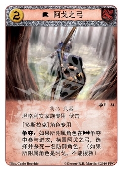 争夺:如果所附属角色在军事争夺争夺中参与进攻,横置阿戈之弓,选择并杀死一名防御角色。(如果所附属角色是阿戈,不能援救)