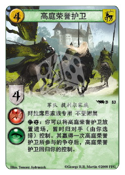 :你可以将高庭荣誉护卫放置进场,暂时归对手(由你选择)控制。其赢得一次高庭荣誉护卫所参与的争夺后,高庭荣誉护卫回归你的控制。