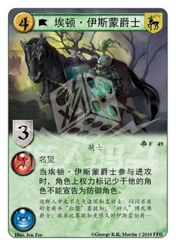 当埃顿·伊斯蒙爵士参与进攻时,角色上权力标记少于他的角色不能宣告为防御角色