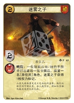 :一位玩家从他/她的手牌中打出最后一张卡牌后,横置一名[原住民]角色,迷雾之子获得1枚权力标记。