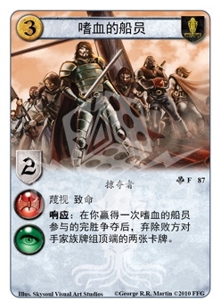 :在你赢得一次嗜血的船员参与的完胜争夺后,弃除败方对手家族牌组顶端的两张卡牌。