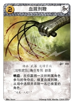 响应:在你赢得一次所附属角色参与的争夺后,横置血腥刑鞭,从场中选择并弃除一名已横置的角色。