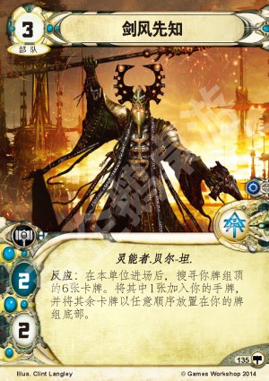 文本反应:在本单位进场后,搜寻你牌组顶的6张卡牌。将其中1张加入你的手牌,并将其余卡牌以任意顺序放置在你的牌组底部。