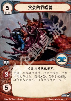 :在本单位通过一次攻击摧毁一个敌方部队单位后,获得X资源。X等于被摧毁单位的印刷费用。(每阶段限定一次。)
