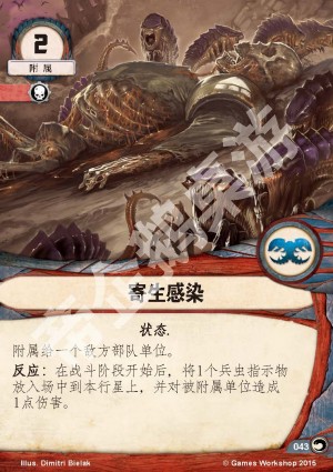 :在战斗阶段开始后,将1个兵虫指示物放入场中到本行星上,并对被附属单位造成1点伤害。