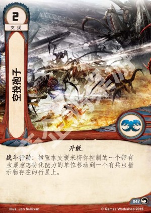 :横置本支援来将你控制的一个带有虫巢意志特化能力的单位移动到一个有兵虫指示物存在的行星上。