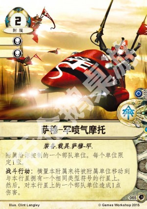 战斗行动:横置本附属来将被附属单位移动到与本行星拥有一个相同类型符号的行星上。然后,对本行星上的一个部队单位造成1点伤害。