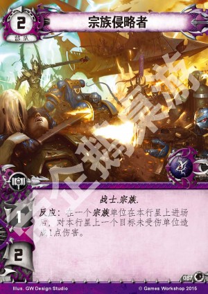文本反应:在一个宗族单位在本行星上进场后,对本行星上一个目标未受伤单位造成1点伤害。
