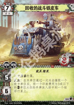 反应:在本单位通过一次攻击摧毁一个敌方单位后,将一个印刷费用为3或以下的兽人单位从你的手牌放入场中到一个相邻行星上。
