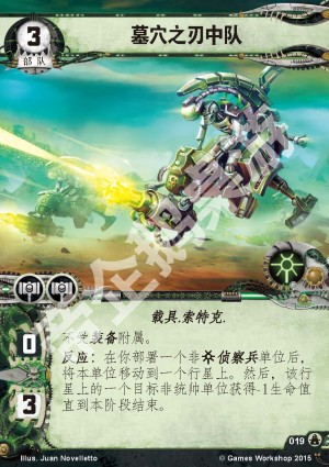 单位后,将本单位移动到一个行星上。然后,该行星上的一个目标非统帅单位获得-1生命值直到本阶段结束。