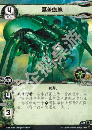 文本战斗行动:在本行星上的一场战役中,从你的手牌中弃掉一张单位卡牌来从本行星上你控制的一个太空死灵部队单位上移除2点伤害。(每个战斗轮限定一次。)
