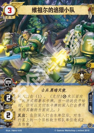 反应:在你深入打击本单位后,对本行星上的一个目标敌方部队单位造成2点伤害。