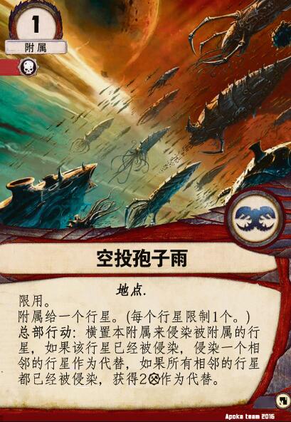 总部行动:横置本附属来侵染被附属行星,如果该行星已经被侵染,侵染一个相邻的行星作为代替,如果所有相邻的行星都已经被侵染,获得2资源作为代替。