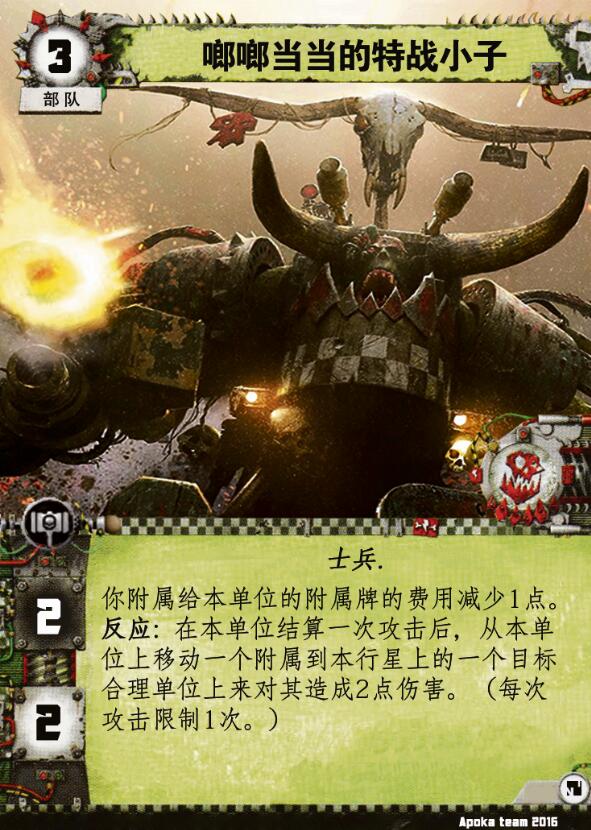 反应:在本单位结算一次攻击后,从本单位上移动一个附属到本行星一个目标合理单位来对其造成2点伤害。(每次攻击限制1次。)