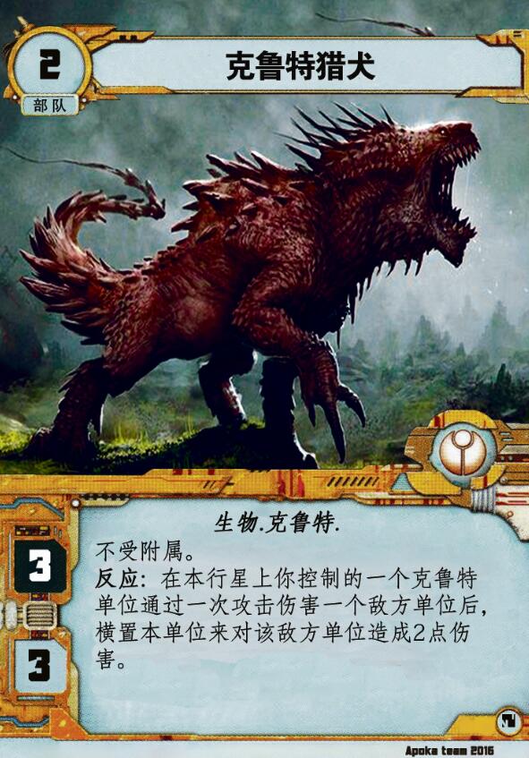 反应:在本行星上你控制的一个克鲁特单位通过一次攻击伤害一个敌方单位后,横置本单位来对该敌方单位造成2点伤害。