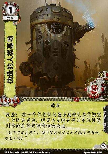 反应:在一个你控制的兽人士兵部队单位被宣告为防御者后,横置本支援并将该单位移动到你的总部来取消该次攻击。