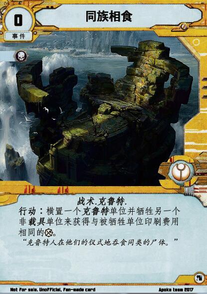 文本行动:横置一个克鲁特单位并牺牲另一个非载具单位来获得与被牺牲单位印刷费用相同的资源。